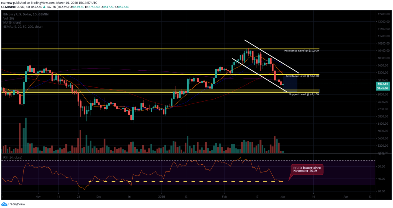 Just a week ago, Bitcoin was trading for more than $10,000 per coin. At the time of writing, the digital asset is trading around the $8,600 support level that it found after a $500 decline on Monday. Unfortunately bullish traders were unable to fight off sell pressure as Bitcoin saw over $1000 erased from its price in a three day period. Since February 13th, the price has entered a downward channel that has experienced multiple tweezer top candlestick patterns. This particular pattern is viewed as a bearish reversal pattern seen at the top of uptrends where two candles occur back to back with similar higher.